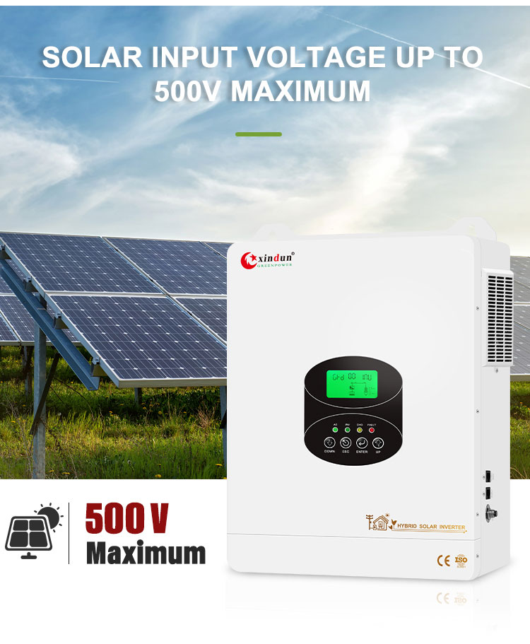 Xindun HFP-S series hybrid inverter supporting 2-way AC output for intelligent load management. The hybrid inverter contains three working modes; grid-connected, off-grid and hybrid mode, which can automatically switch according to user needs and flexibly adapt to different power environments. DC 24 volt / 48 volt to AC 220 volt / 230 volt / 240 volt, built-in MPPT solar controller, with a maximum photovoltaic input voltage of 500V, can effectively collect and convert electricity from solar panels to ensure efficient and stable operation of the system. Its maximum conversion efficiency can reach 94%, and the MPPT tracking efficiency is as high as 99.9%, ensuring the efficient operation of the system. It also supports working without batteries to meet different power needs. Contact us for competitive prices.